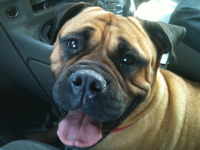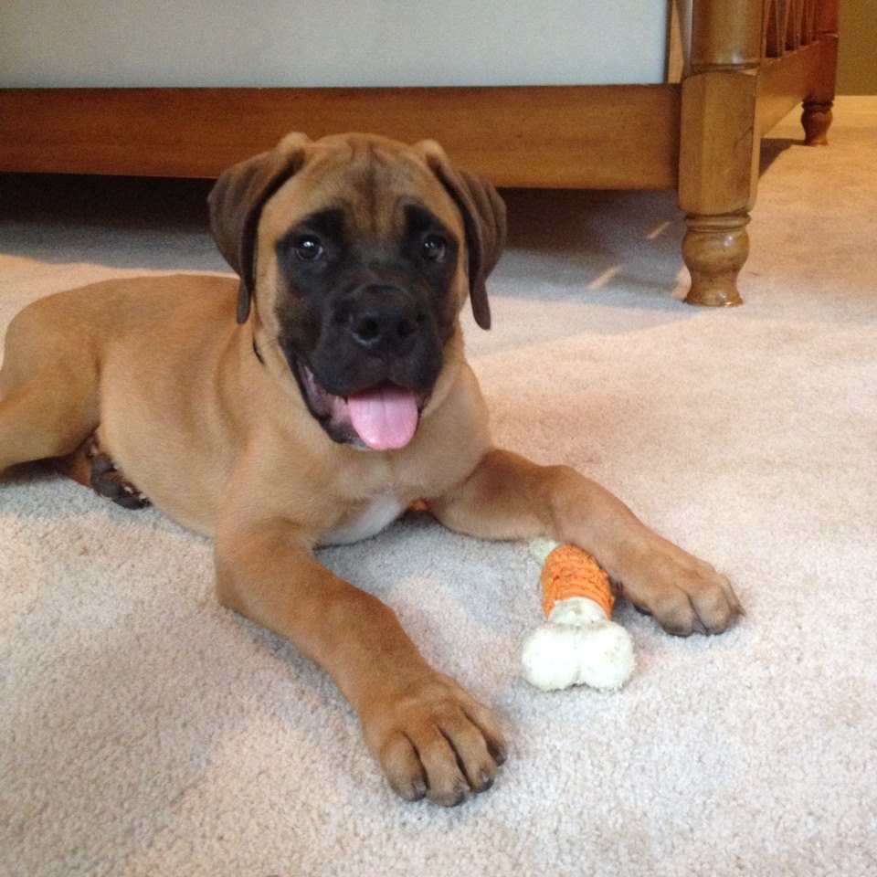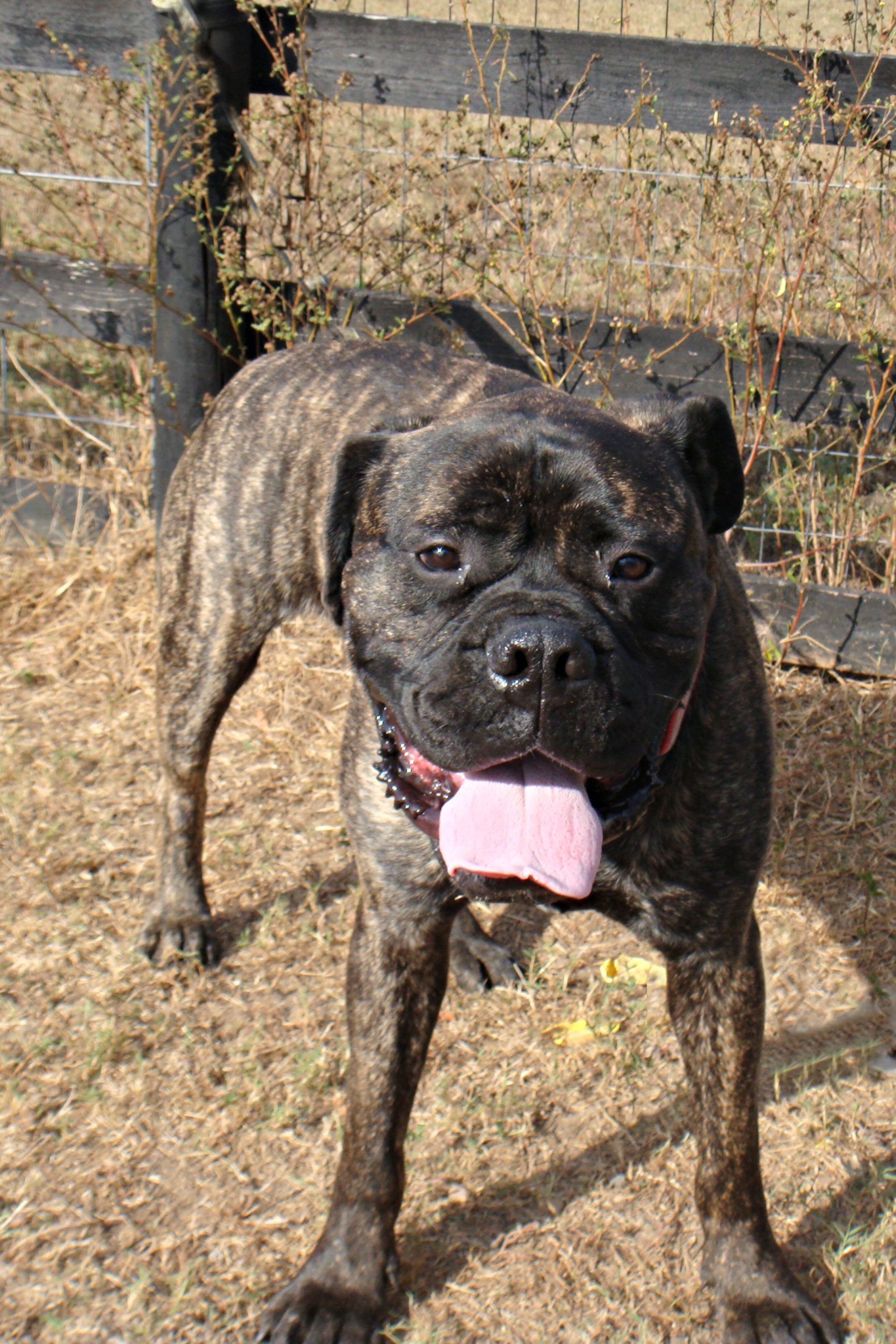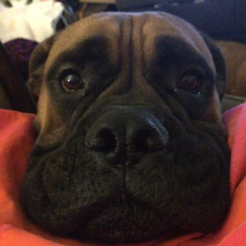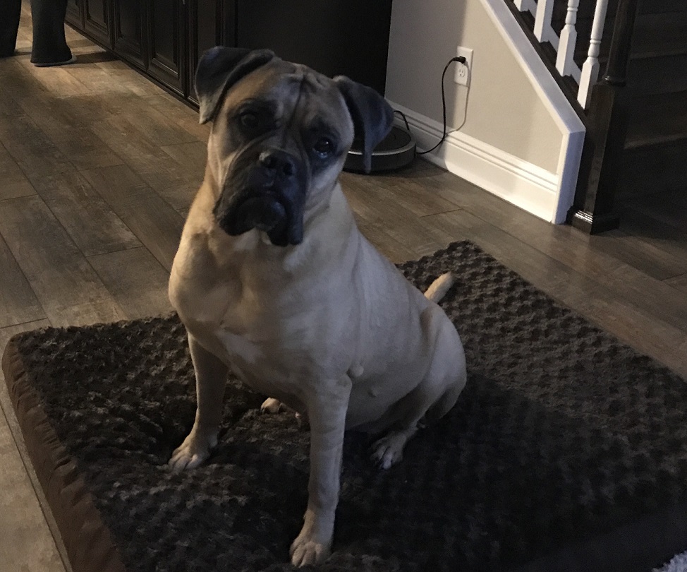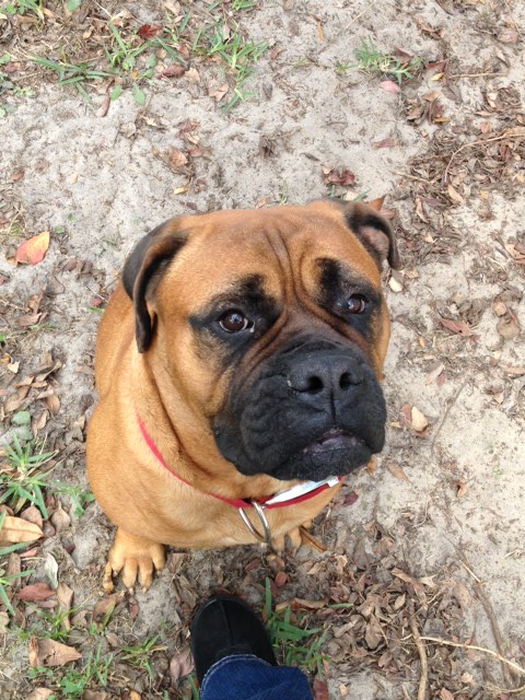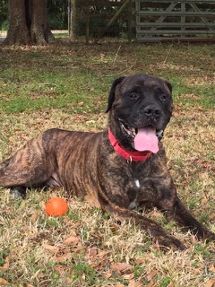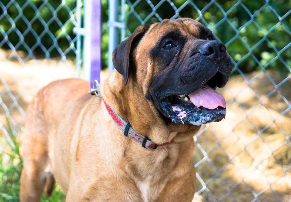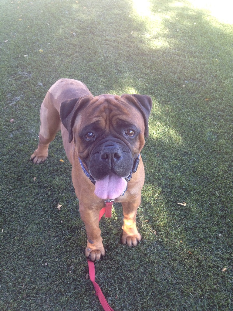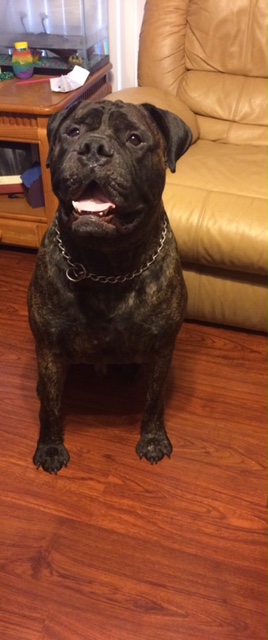It turns out that Optimus is a wonderful, kind and patient bull mastiff! He likes children, chickens and other dogs. Cats make him a little worried, but he hasn’t chased them – even when they’ve run from him. He’s fostered in a house with four other dogs – 2 of them male and one of them blind. Optimus has integrated nearly seamlessly into the household. At first, he was anxious and unsure in a crate. But after a few days he became a relaxed, sprawled-out member of the household. Loud noises, running children, thunder, even a Roomba – Optimus has learned to deal with anything.