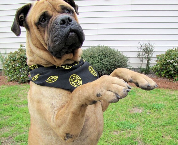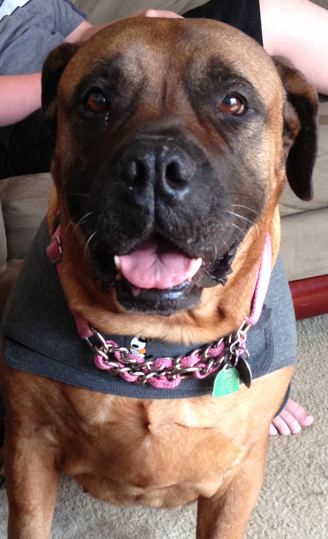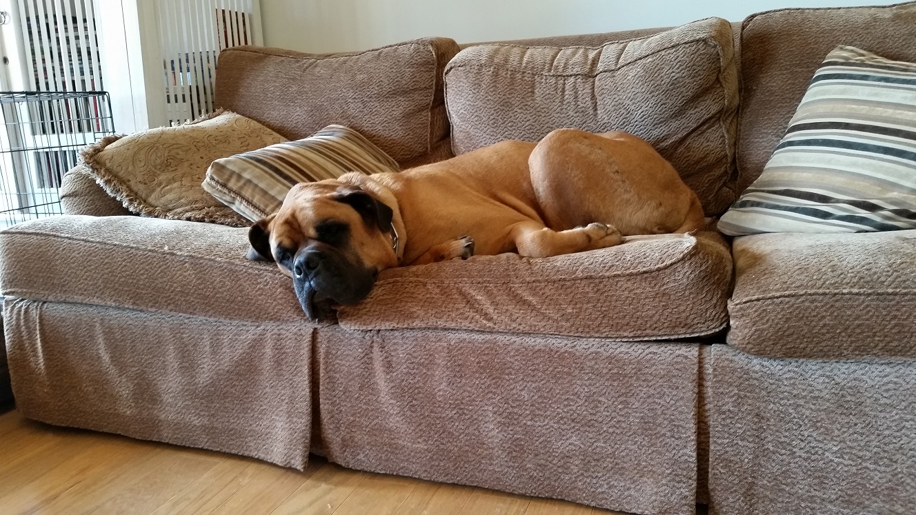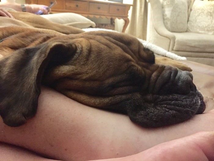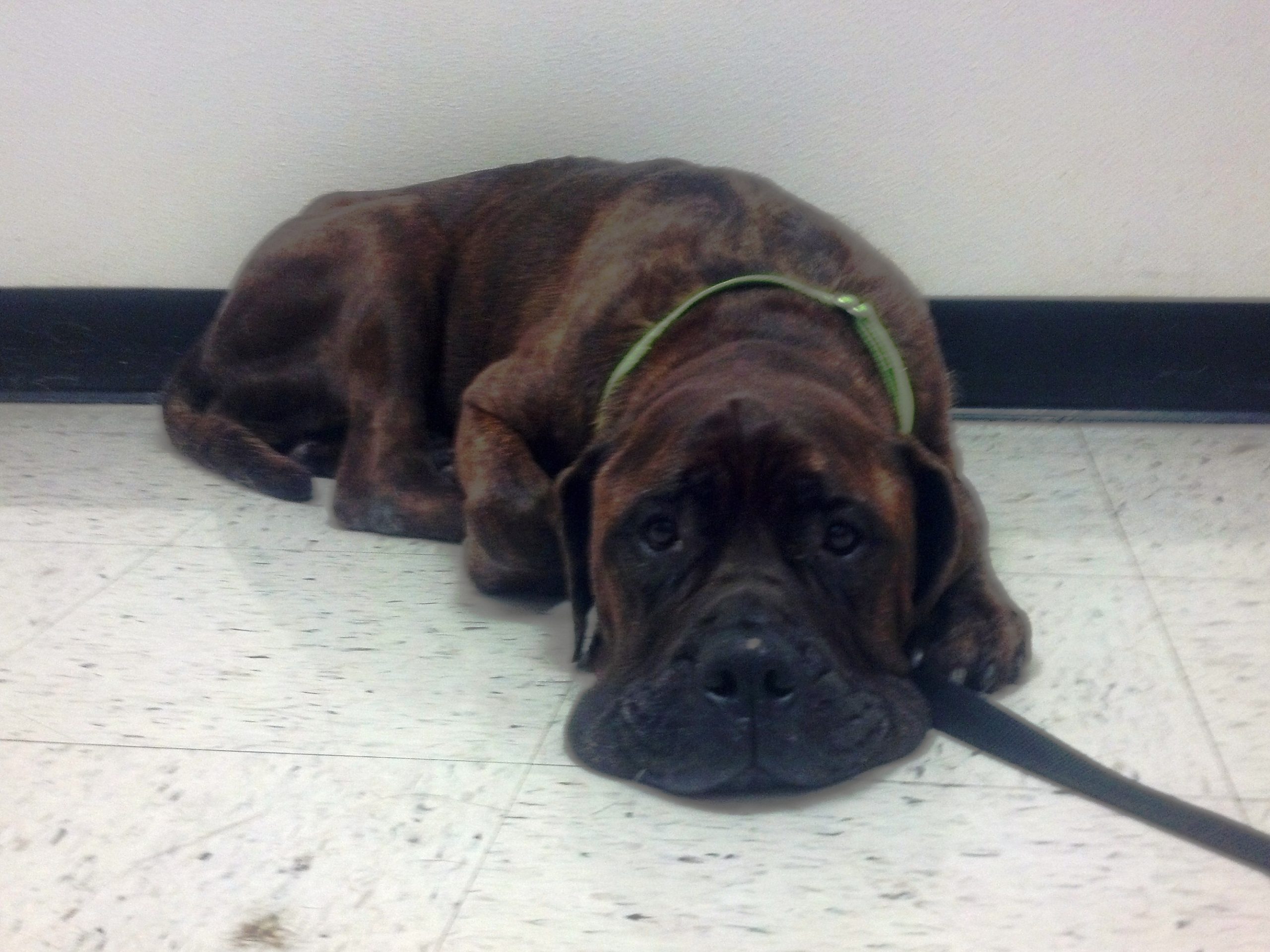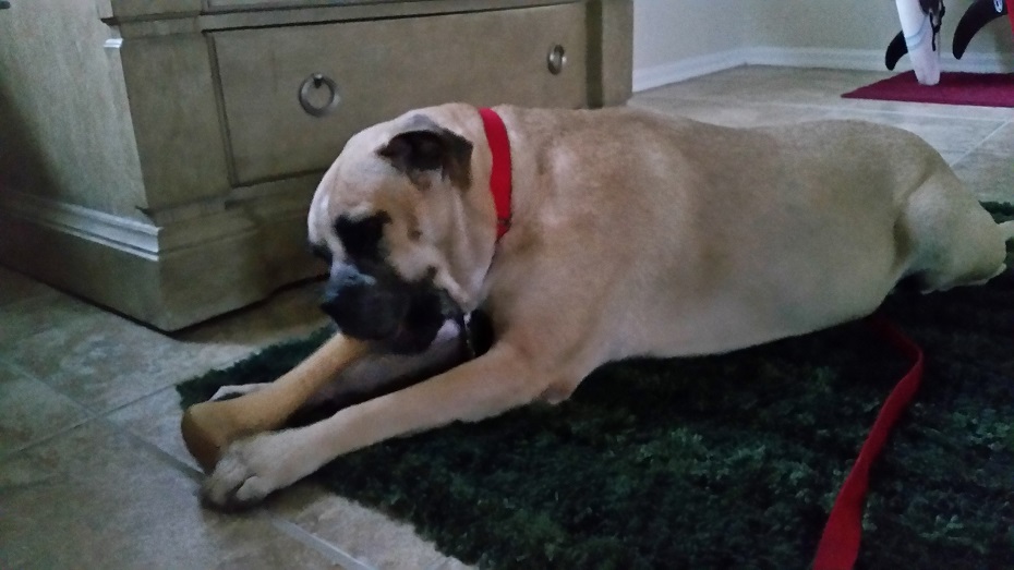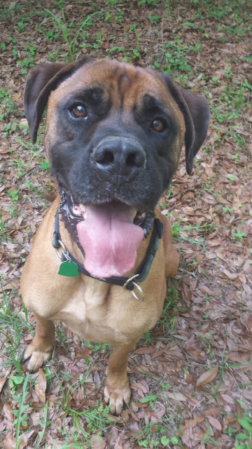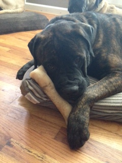 It turns out that Optimus is a wonderful, kind and patient bull mastiff! He likes children, chickens and other dogs. Cats make him a little worried, but he hasn’t chased them – even when they’ve run from him. He’s fostered in a house with four other dogs – 2 of them male and one of them blind. Optimus has integrated nearly seamlessly into the household. At first, he was anxious and unsure in a crate. But after a few days he became a relaxed, sprawled-out member of the household. Loud noises, running children, thunder, even a Roomba – Optimus has learned to deal with anything.