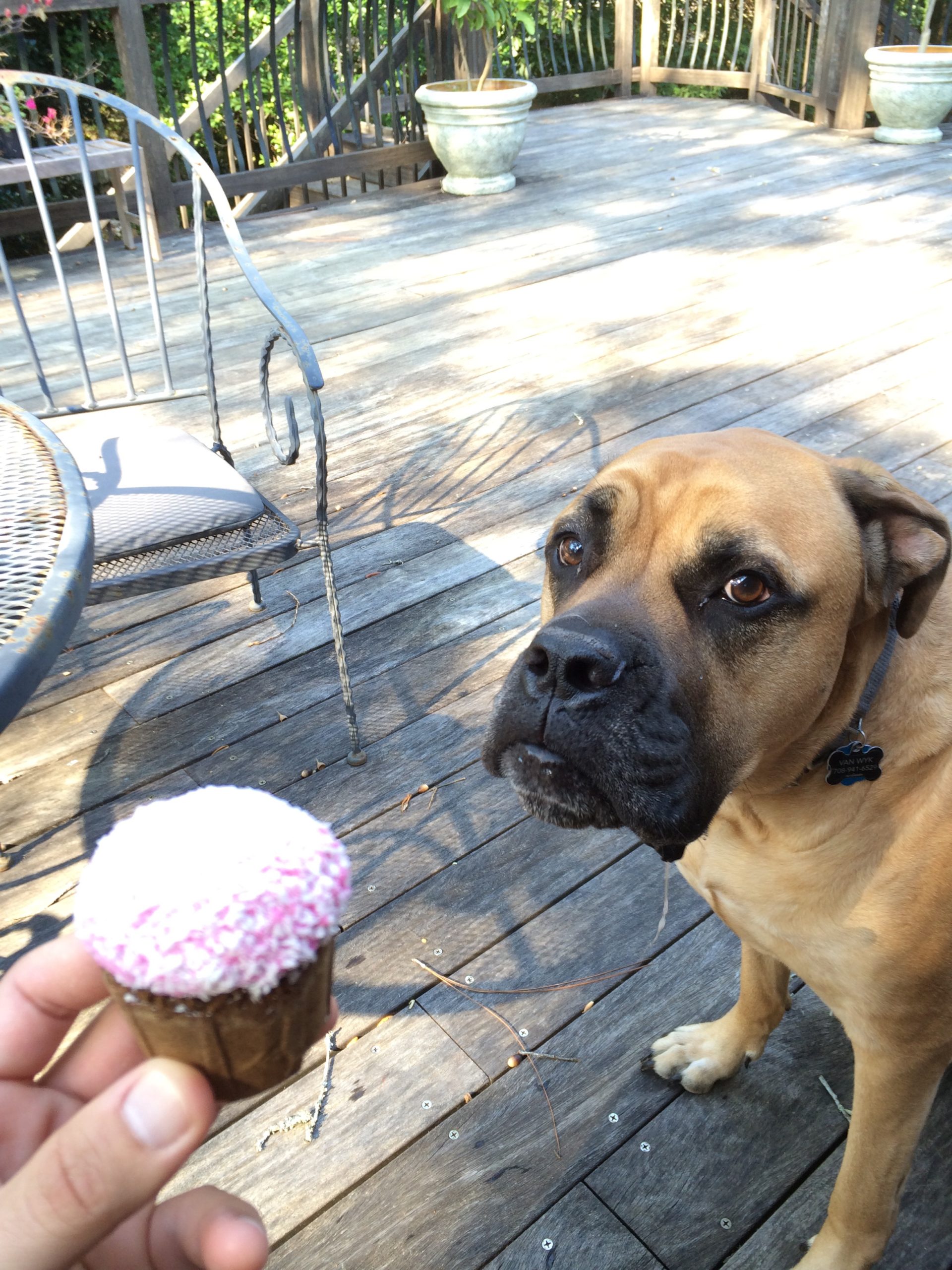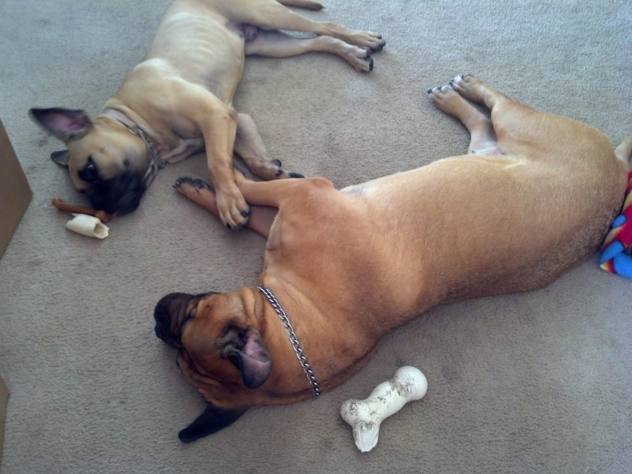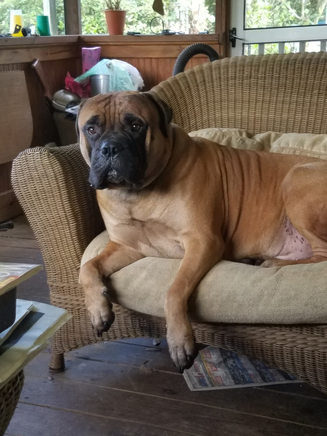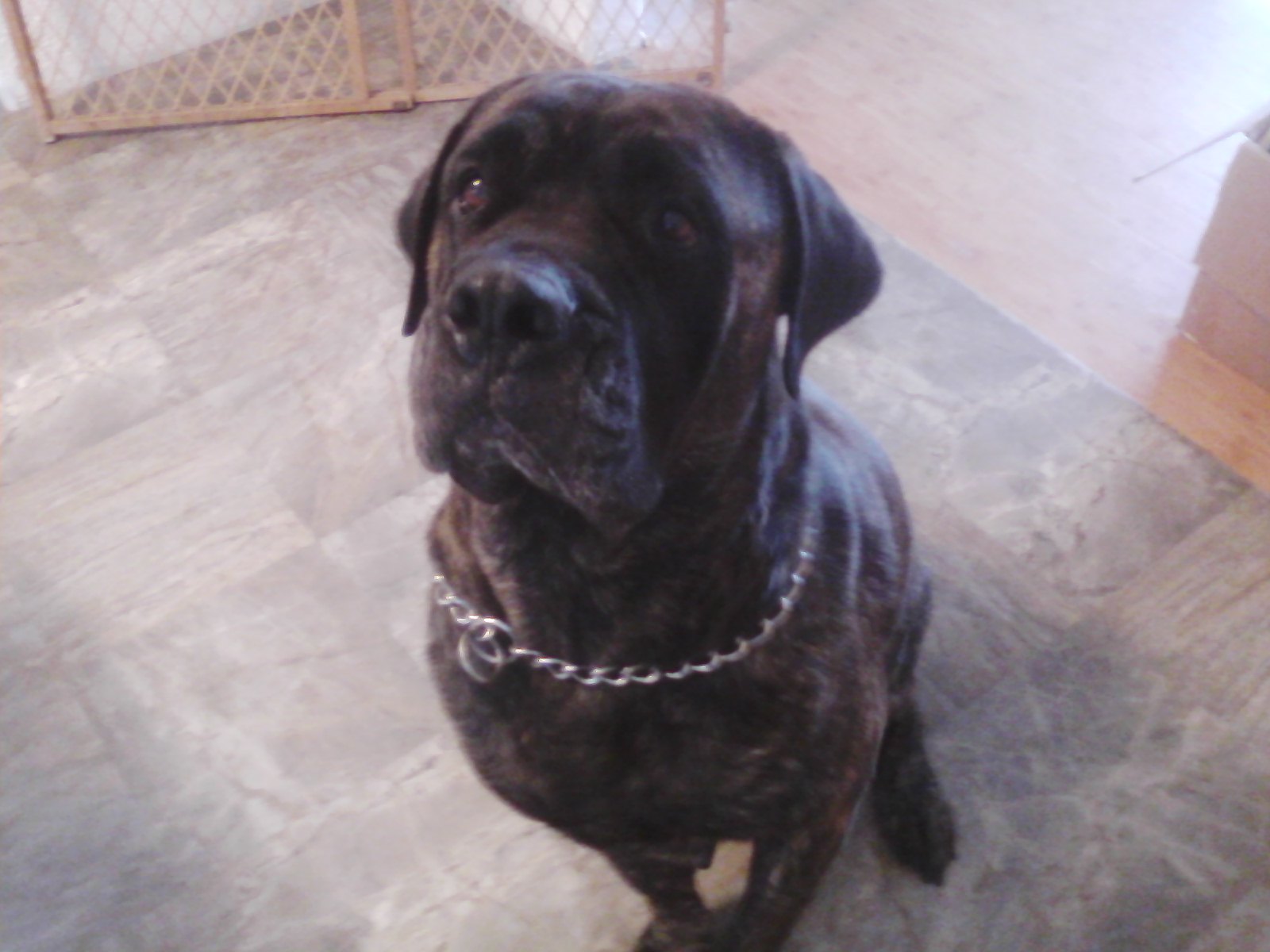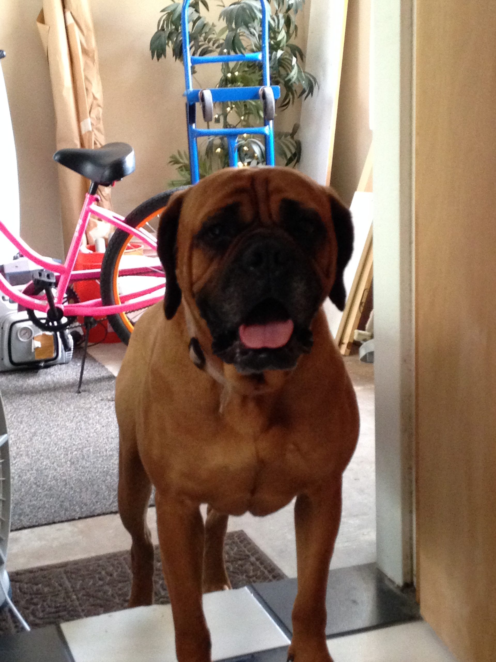 It turns out that Optimus is a wonderful, kind and patient bull mastiff! He likes children, chickens and other dogs. Cats make him a little worried, but he hasn’t chased them – even when they’ve run from him. He’s fostered in a house with four other dogs – 2 of them male and one of them blind. Optimus has integrated nearly seamlessly into the household. At first, he was anxious and unsure in a crate. But after a few days he became a relaxed, sprawled-out member of the household. Loud noises, running children, thunder, even a Roomba – Optimus has learned to deal with anything.